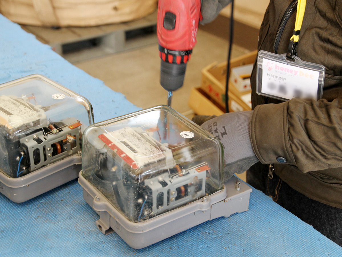 就労施設内での作業は、電気メーターを一定量預けて、分解が完了次第納品となる出来高制です。一方、弊社作業所では各所から集まってくる電気メーター部品の分別や、大型変圧器の解体などを行っています。ハニービーさんには1日あたり10~15時の時給制で、施設スタッフ1名と利用者3名のチームで作業していただいています。